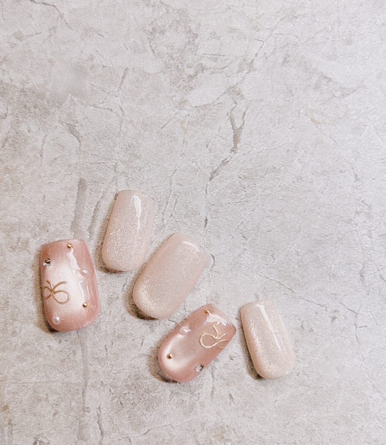 パール使いが上品な、大人の女性が楽しみやすいリボンネイルです。
