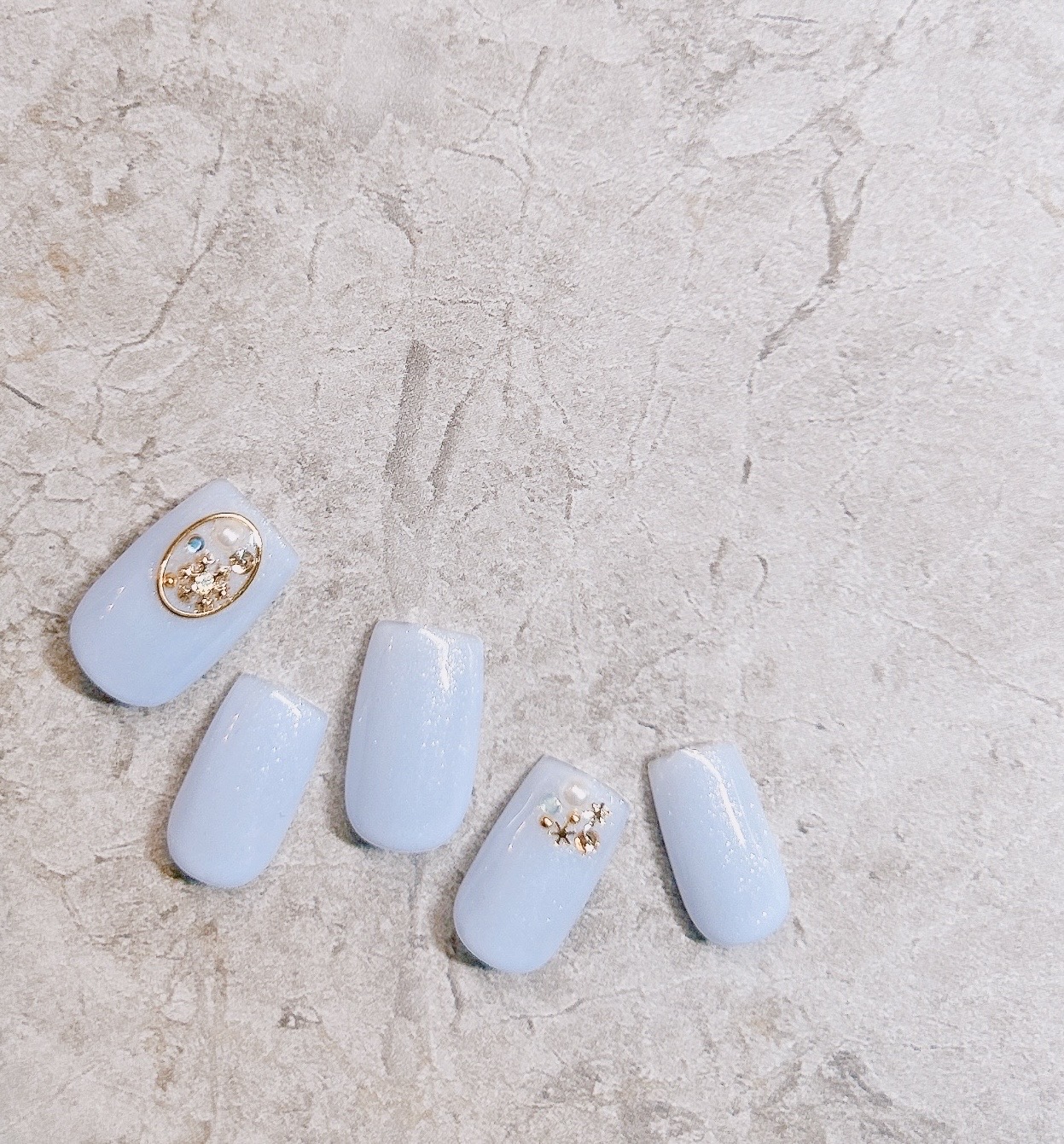 2種類の雪の結晶パーツを取り入れて、冬しかできないシーズンネイルに。