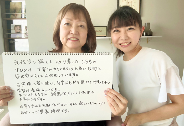 誰もが年を重ねる中で自然と出てくるお悩み事。当店ではしっくりくる大人ネイルのご提供と同時に、健やかな手足で美しく年齢を重ねてゆくお手伝いをいたしております。